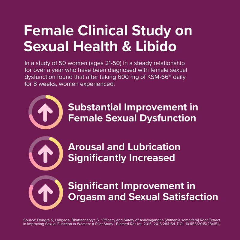 In a study of 50 women (ages 21-50) in a steady relationship for over a year who have been diagnosed with female sexual dysfunction found that after taking 600mg of KSM-66™ daily for 8 weeks, women experienced: