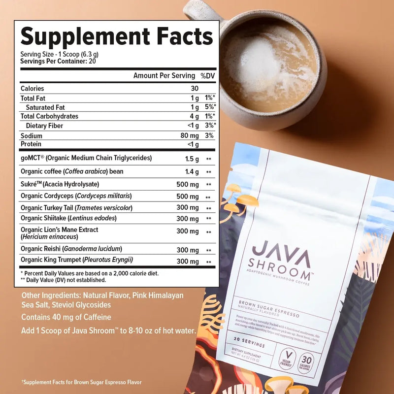 Energize your mornings with Java Shroom™—a fraction of the caffeine than regular coffee but packed with powerful natural ingredients for lasting health benefits.*