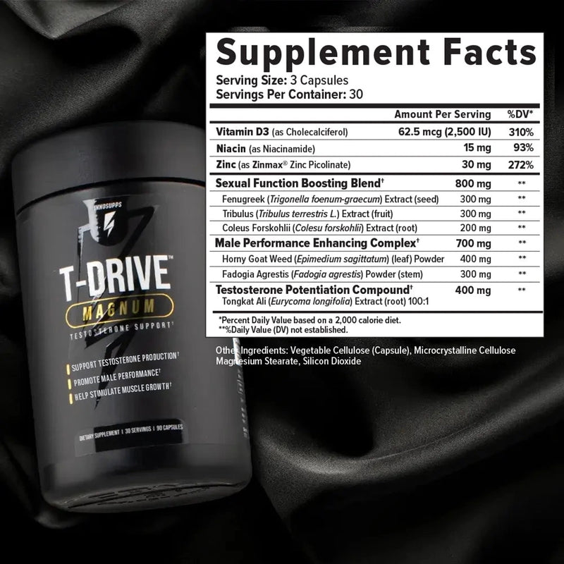 T-Drive™ Magnum is packed with natural ingredients. Unlike prescriptions or other therapies, T-Drive™ Magnum works by firing up your body's own testosterone and vital hormones from the inside. However, it is always essential to discuss starting a new supplement regime with your healthcare professional.*