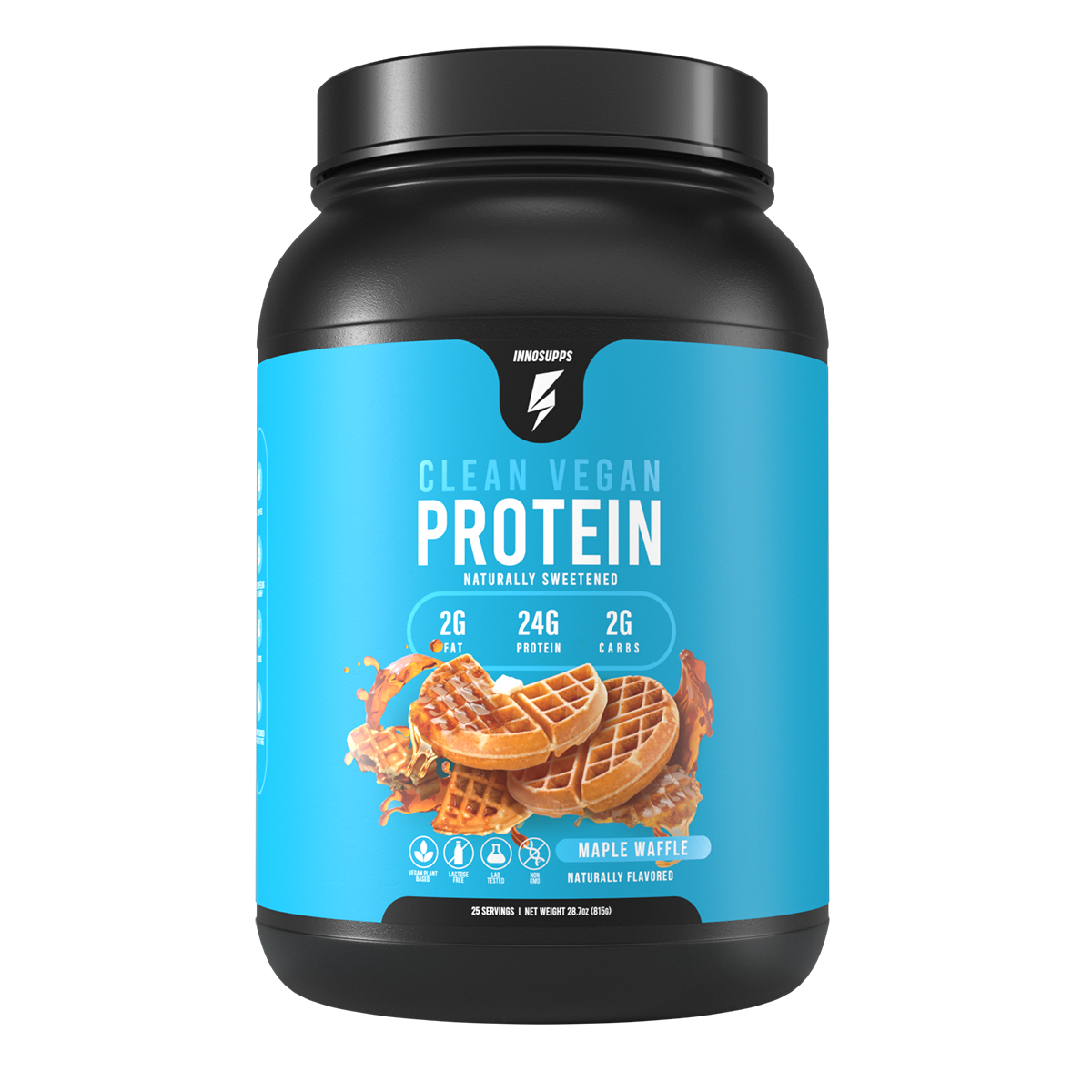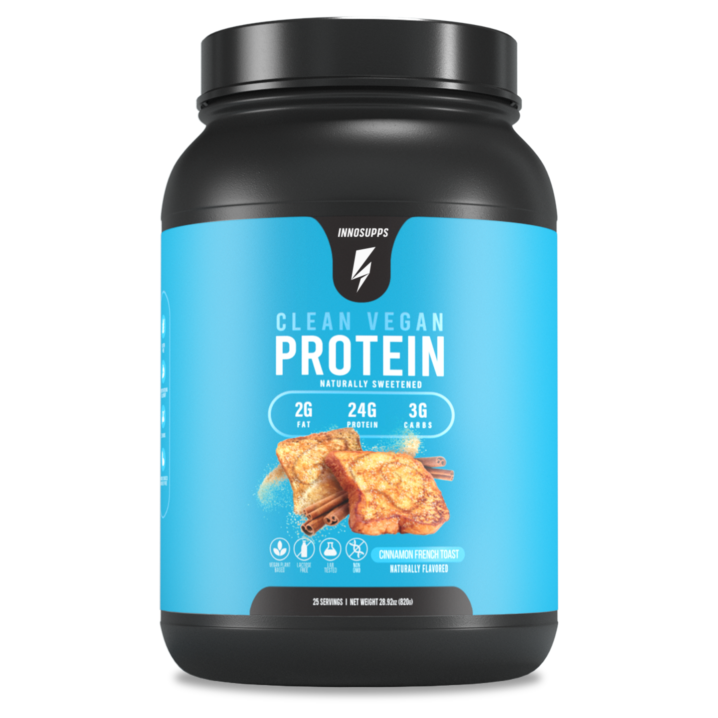 There are 25 servings in each tub of Clean Vegan Protein, and each serving contains 24 grams of protein.*